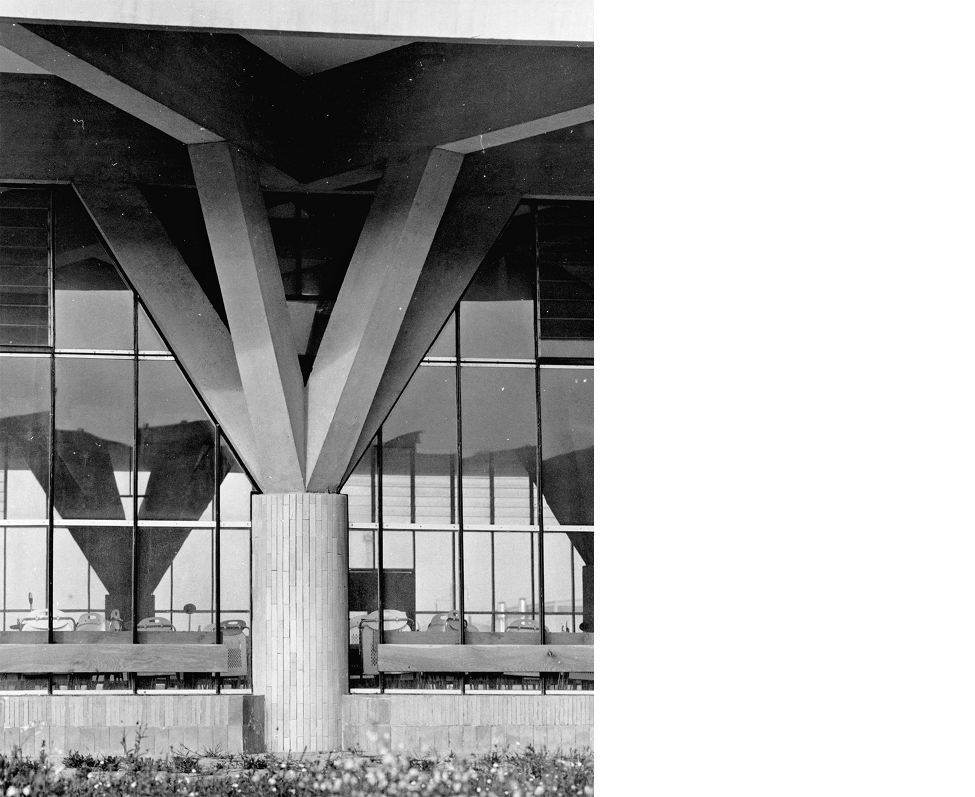 La portineria principale è un portico formato da 12 ombrelli quadrati rovesci in c.a. a parete sottile di 12m di lato: